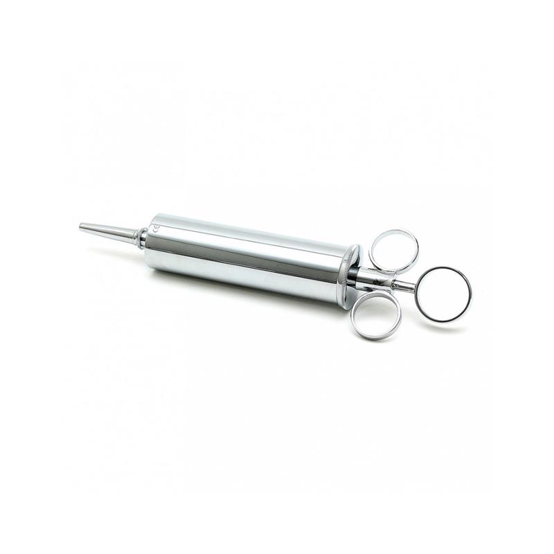 Jeringa de acero chapado para introducir glicerina. Capacidad de 100cc.